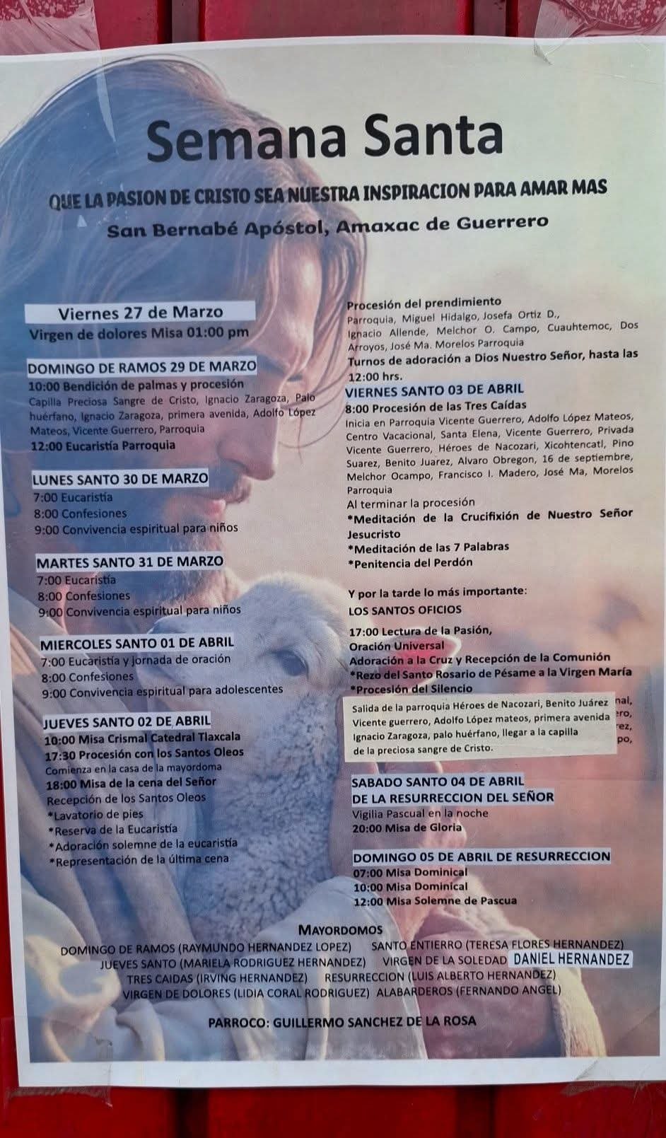 La Parroquia de San Bernabé Apóstol dio a conocer el programa de actividades religiosas que se llevarán a cabo con motivo de la Semana Santa 2026, con celebraciones litúrgicas y procesiones programadas del 27 de marzo al 5 de abril. De acuerdo con el cartel difundido, las actividades iniciarán el viernes 27 de marzo con la misa de la Virgen de Dolores a la 1:00 de la tarde. El domingo de Ramos, 29 de marzo, se realizará la bendición de palmas y procesión a las 10:00 horas en la Capilla Preciosa Sangre de Cristo, seguida de la eucaristía parroquial al mediodía. El programa contempla también confesiones, convivencias espirituales para niñas, niños y adolescentes, así como la misa crismal y la procesión con los santos óleos el Jueves Santo. Para el Viernes Santo se prevé la procesión de las Tres Caídas, la meditación de la crucifixión de Jesucristo, la reflexión de las Siete Palabras y los Santos Oficios por la tarde. Las actividades continuarán el Sábado de Gloria con la Vigilia Pascual a las 20:00 horas, y concluirán el Domingo de Resurrección con misas a las 7:00, 10:00 y 12:00 horas. El programa parroquial forma parte de las celebraciones tradicionales que cada año reúnen a la comunidad católica de Amaxac de Guerrero en torno a la conmemoración de la Pasión, Muerte y Resurrección de Jesucristo. Navegación de entradas Impulsan innovación gastronómica con curso especializado en Amaxac Recorre presidente de Ixtacuixtla zona del Zacatonal para impulsar su rescate ambiental